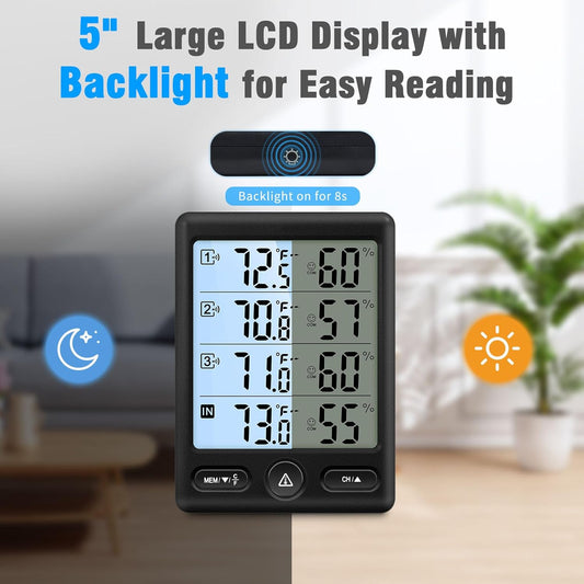 Geevon Indoor Outdoor Thermometer Wireless 3 Remote Sensors, 5-Inch Display Digital Hygrometer Thermometer Temperature Humidity Monitor with 8S Backlight, Battery-Powered (Black)