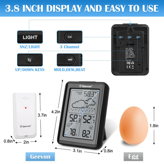 Geevon Indoor Outdoor Thermometer Wireless 200ft/60m, Digital Temperature Humidity Monitor with Large Display, Hygrometer with Weather, 3 Channel, Mold/Dew/Heat, 10s Backlight