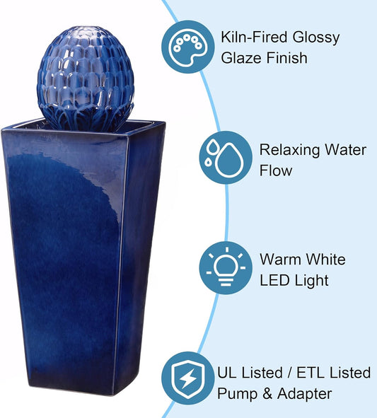Glitzhome Ceramic Outdoor Water Fountain with LED Light, Oversized Artichoke Pedestal Water Fountains with Submersible Pump, Patio Fountain Waterfall for Garden Patio Deck Porch, Cobalt Blue, 35.75" H