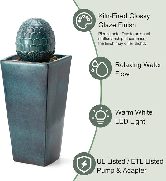Glitzhome Ceramic Outdoor Water Fountain with LED Light, Oversized Artichoke Pedestal Water Fountains with Submersible Pump, Patio Fountain Waterfall for Garden Patio Deck Porch, Turquoise, 35.75" H