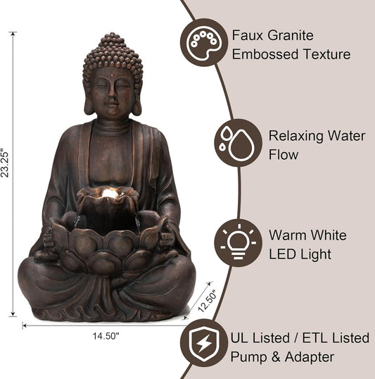 Glitzhome Buddha Fountain with Pump & LED Light, 2 Tier Zen Style Meditating Buddha Water Fountain Outdoor Fountains and Waterfalls Floor Fountains Buddhas Statues for Garden Patio Backyard 23" H