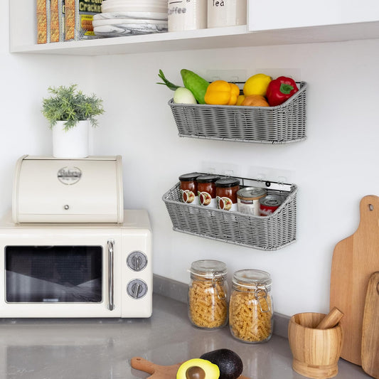 GRANNY SAYS Wicker Hanging Basket, 2 Pack Storage Baskets for Cabinet, Wall Mount Fruit Basket for Kitchen, Adhesive Bathroom Cabinet Organizer, Pantry Organizers and Storage, Gray