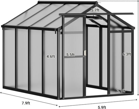 Greenhouse, 6x8 Ft Outdoor Greenhouses with Roof Vents and Sliding Doors, Aluminum Frame Polycarbonate Accessible Greenhouses, Suitable for Outdoor Gardens and Backyards, Black