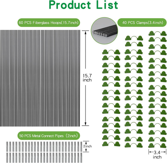 Greenhouse Hoops Grow Tunnel 60 Pcs 16 Inch Up to 12 Sets of 7ft Long Plastic-Coated Rust-Proof Fiberglass Garden Hoops for Raised Beds with 50 Pcs Metal Connect Pipes and 40 Clamps