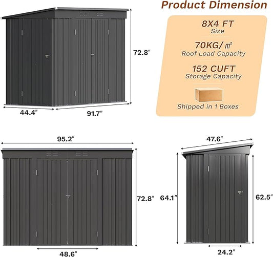 Greesum 8x4FT Outdoor Storage Shed, Metal Shed with Triple Lockable Door, Utility Tool Storaged Garden Shed with Slopping Roof for Patio Storage, Black