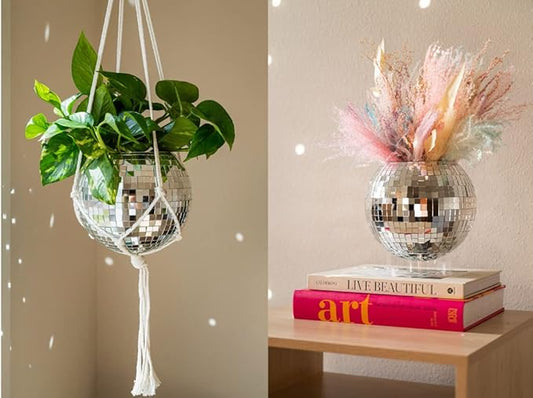 Hanging Disco Ball Planter 8" - with Acrylic Stand and Macrame Plant Hanger - Home Décor, Room Décor, Patio or Boho Décor, Mirror Disco Planter, Disco Decor (8" with Base)