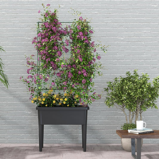 HAPPYGRILL Raised Garden Bed with Lattice Trellis, 4 Drainage Holes, Wooden Elevated Planter Box with Legs for Climbing Vine, Hanging Small Flower Baskets, Outdoor Gardening Planter for Patio Balcony