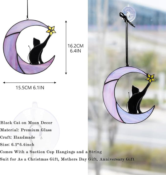 HDCRYSTALGIFTS 6.5'' Black Cat Decor on Purple Moon Stained Glass Window Hanging Suncatcher,Wall Art Glass Window Panel Sun Catcher,Halloween Ornament Decoration Memorial Gift for Lover Cat Loss