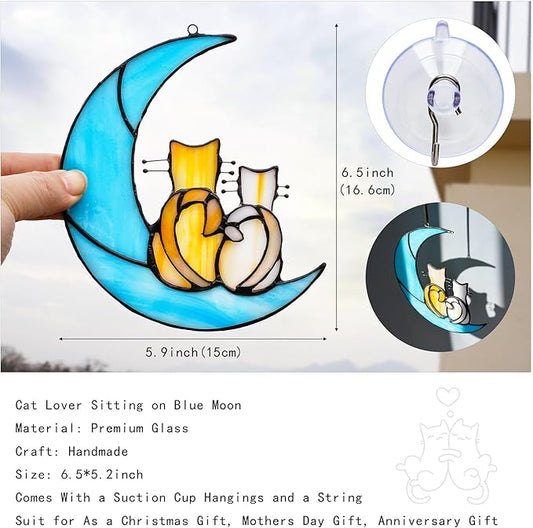 HDCRYSTALGIFTS Couple Cat Sitting on Moon Stained Glass Window Hanging, Modern Art Suncatcher for Window, Wall Decor,Cat Lover Gifts for Women/Girls