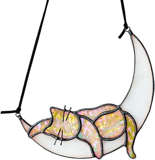 HDCRYSTALGIFTS Orange Cat On Moon Stained Glass Window Hangings,Tabby Cat Decoration suncatcher Hanging Ornament Gift for Mom,Cat Memorial Gifts for Cat Lovers, Pet Loss Sympathy Gift