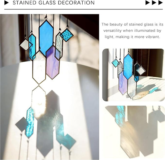 HDCRYSTALGIFTS Stained Glass Window Hanging Suncatchers - 7 Pieces Handcrafted Element Earth Tones Set,Modern Blue Wall Art Sun Catchers Indoor Window Glass Decor Gifts for Mom,Grandma