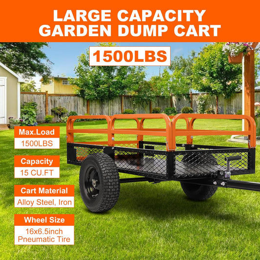 Heavy Duty Steel Garden Cart, 1500Lbs Yard Garden Pull Behind Dump Trailer with Removable Sides for Atvs Utvs Lawn Garden Tractors, Orange