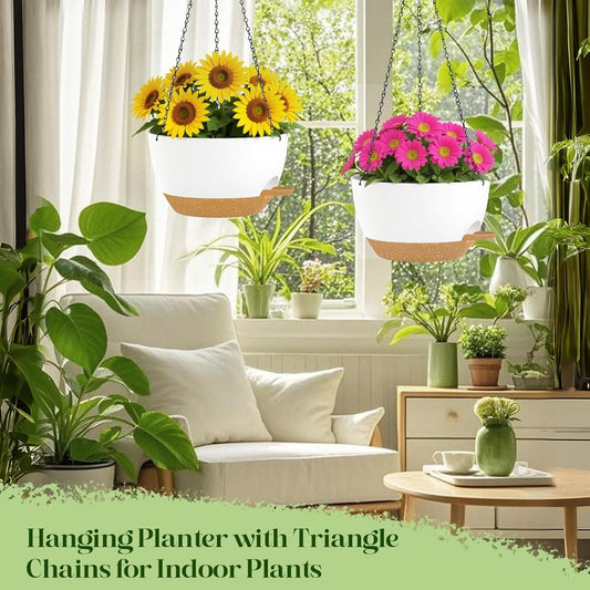 10 Inch Hanging Planters with Chains 2 Pack Self Watering White Brown Plastic Hanging Pots for Indoor Outdoor Plants, Garden Porch Home Decor (White Brown)
