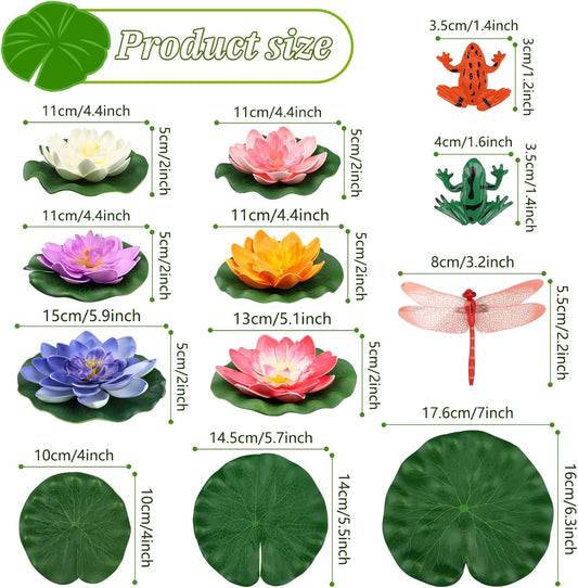 22 Pack Artificial Floating Foam Lotus Flowers with Artificial Frog Lotus Leaves, Lily Pads for Lake, Pond Plants Ornaments for Pool Water Decoration, Colorful