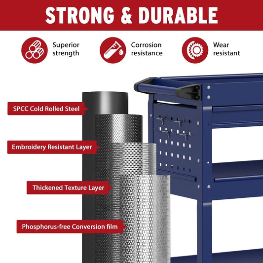 3 Tier Rolling Tool Cart, Heavy Duty Tool Cart on Wheels, Metal Utility Cart with Locked Drawers, Ideal for Garage, Warehouse and Repair Shop (Dark Blue)
