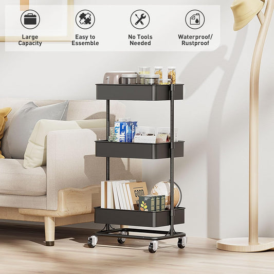 3 Tier Modern Metal Rolling Tool Cart with Silent Casters, 17.72Γ12.40Γ35.04 inch Heavy Duty Organization Truck Trolley Organizer for Office, Living Room, Kitchen, (Black)