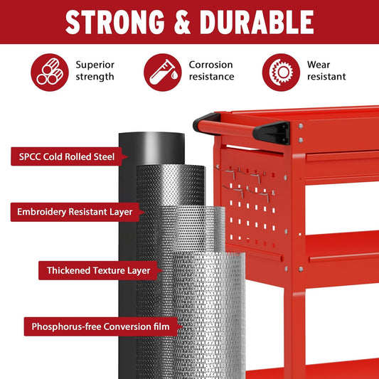 3 Tier Rolling Cart, Heavy Duty Utility Industrial Service Carts on Wheels, Metal Tool Cart with Locked Drawers, Ideal for Garage, Warehouse and Repair ShopοΌRedοΌ