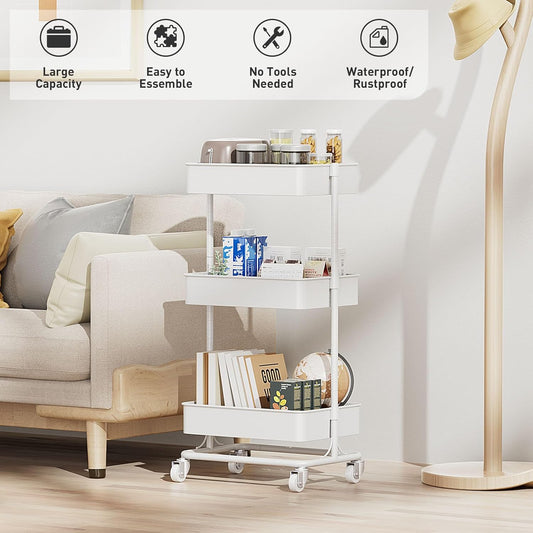3-Tier Modern Metal Rolling Utility Cart with Silent Casters, 15.35x11.81x23.74 inch Heavy Duty Organizing Cart Trolley Organizer for Office, Living Room, KitchenοΌ(White)