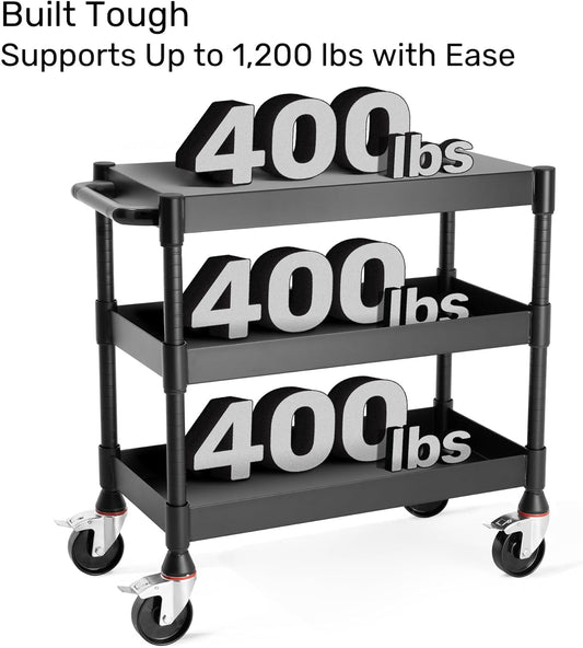 3-Tier Commercial Utility Cart, 3 Shelves Steel Service Tool Cart with Brake Wheels for Mechanics, 330lbs Heavy Duty Rolling Utility Carts Tub Storage Cart for Warehouse Office Garage, Black