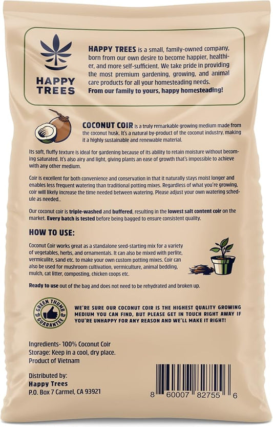 Happy Trees Coco Coir Loose Coconut Fiber Growing Medium, Potting Mix, Seed-Starting, Premium Quality, Triple-Washed for Low Salt/EC, pH Balanced, Peat-Free, OMRI Organic, 50L (1.8 cu.ft.)