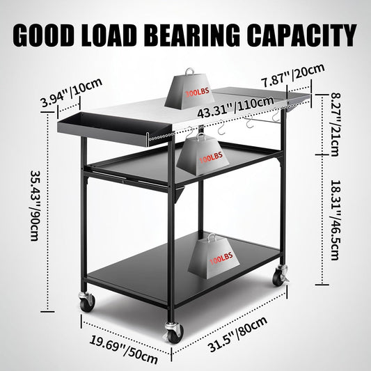 Black Outdoor Grill Cart with Wheels, Heavy-Duty 3-Tier BBQ Prep Table for Pizza Oven, Griddle, Patio β Rustproof Commercial Kitchen Cart with Tool Hooks