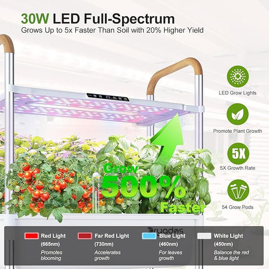 Indoor Garden Hydroponic Growing System with 54 Pods Herbs Garden Kit with 30W Led Grow Light Large Movable 2-Layer Floor-Standing Hydroponic Gardening System Planter Grower for Vegetable Fruit