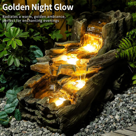 34.5" L Garden Outdoor Water Fountain, Floor Standing Wood Imitation Resin Natural Waterfall Fountains with LED Lights for Patio, Porch, Home Art Decor