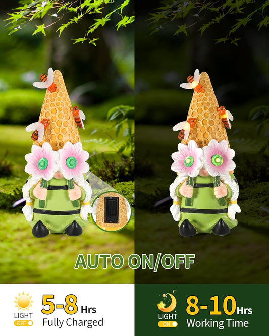 iStatue Solar Garden Gnome Figurine Light with Bees Sunflower, 9.5'' Resin Outdoor Statue for Yard Patio Decor Lawn Ornaments Porch Garden Gifts for Women/Girl (Ms Bee Gnome)