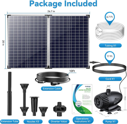 POPOSOAP 70W Solar Pond Pump,Solar Fountain Pump 580GPH Adjustable Flow, Outdoor Solar Water Pump with 17Ft+10Ft Cord & 6.6Ft PVC Tubing for Ponds, Fountain Waterfall-P170H