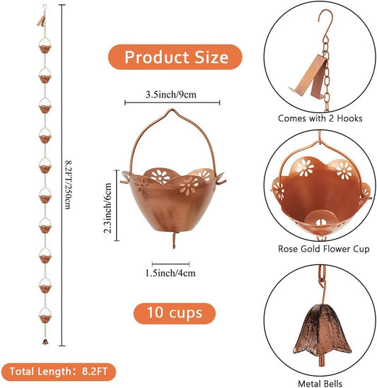 8.5 FT (102 Inch) Decorative Rain Chain for Gutters - Handcrafted Iron Flower Cup Design, Outdoor Water Drainage Solution for House Eaves, Garden, Patio & Home Decor