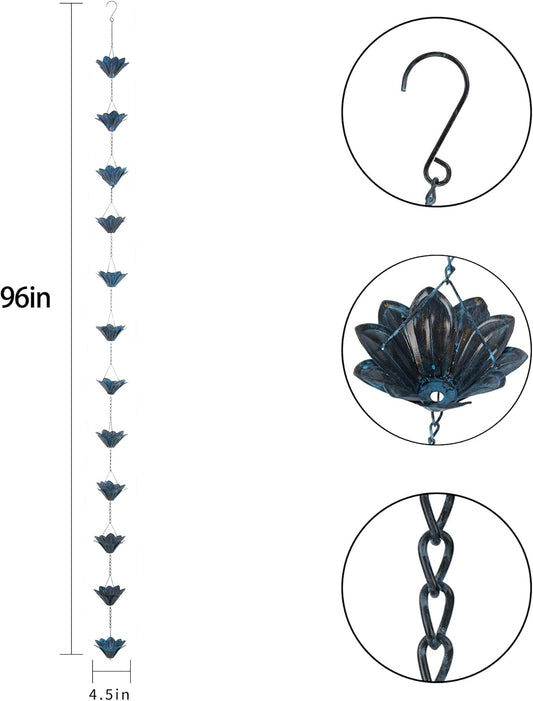 Metal Rain Chain Decoration 8.5FT., Rain Catcher Metal Chain Gutter Downspout 104'' for House Eaves, Garden & Home, Flower Cups Garden Decoration,Lake Blue