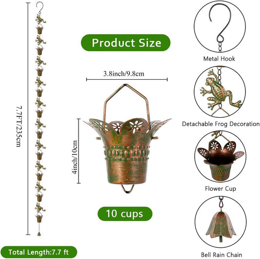 7.7FT Rain Chain for Outside, Rain Chain with 10 Frog Cups Adjustable Rain Chains for Gutters, Eaves, Drainage, Replacement for Downpout