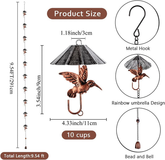 9.54 FT Rain Chain, Umbrella-Shaped Rain Chain for Outside with 10 Cups & Hummingbird Decor, Adjustable Rain Catcher Chain for Gutters, Eaves, Drainage, Replacement for Downpout