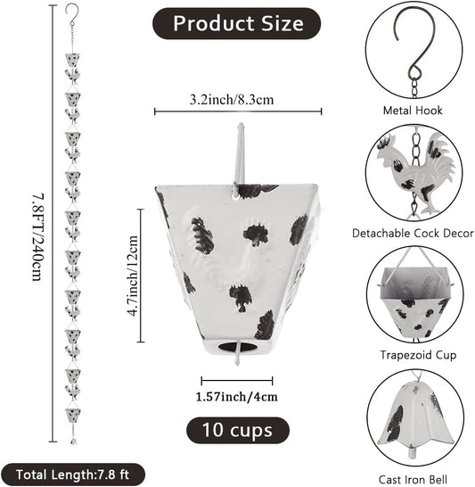 7.8FT Rain Chain for Outside, Rain Chain with 10 Rooster Cups Adjustable Rain Chains for Gutters, Eaves, Drainage, Replacement for Downpout