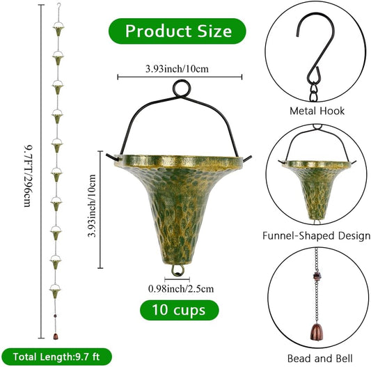 9.7ft Rain Chain, Rain Chain for Outside with 10 Funnel Shaped Cups Adjustable Metal Chain Rain Catcher Chain for Gutters, Eaves, Drains, Replacement Downspouts (Green)