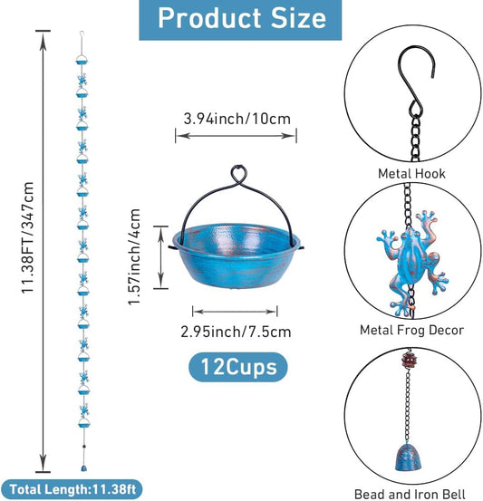 Rain Chain, 11.4FT Frog Rain Chains with 12 Cups, Functional and Decorative Replacement Downspout Rain Chains for Outside