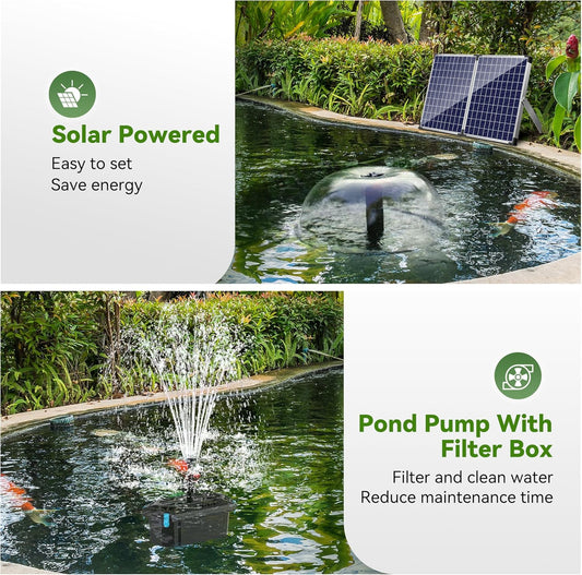 Antfraer Solar Fountain Pump with Pond Filter Kit, 40W Panel Solar Pond Pump with Pond Filter Box, Pond Filter for Outdoor Pond Garden Fountains Waterfalls DIY Water Feature
