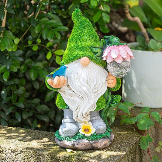 Garden Gnome Statue - Funny Gnome Decoration Hold Flower with Solar Crackle Glass Globe Lights, Resin Gnome Figurine Ornament for Patio Yard Lawn Porch Outdoor Decor