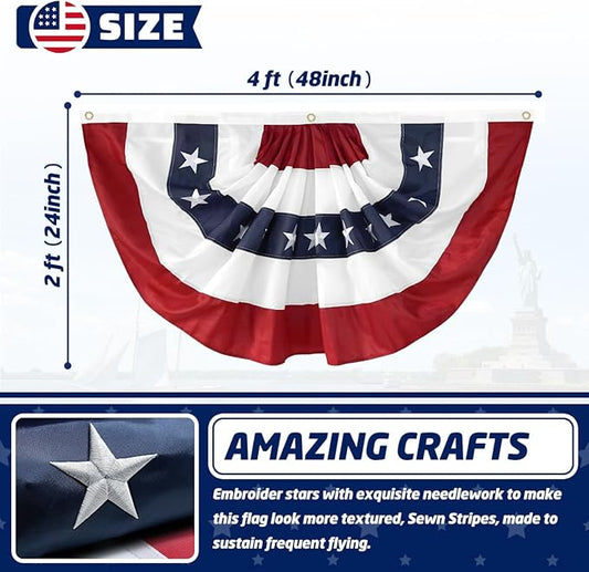 2x4 Ft American Pleated Fan Flag USA Bunting 4th of July Flags Decor Outside Porch Garden Banner Embroidered Patriotic Stars & Sewn Stripes Canvas Header Brass Grommets