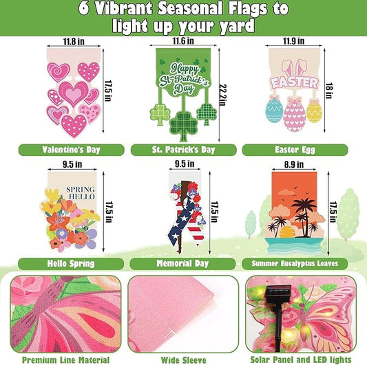 6 Set Seasonal Garden Flags 8 Modes Solar LED Double Sided 12 x 18 Inch Small Yard Flag Outdoor Lighted Spring Summer Easter Memorial St. Patrick's Day Valentine Garden Decor for All Seasons