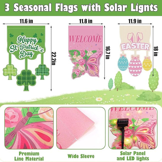 3 Set Seasonal Garden Flags with 8 Modes Solar LED Double Sided 12 x 18 Inch Small Yard Flags Outdoor Lighted Welcome Spring Easter St. Patrick's Day Clover Garden Decor for All Seasons