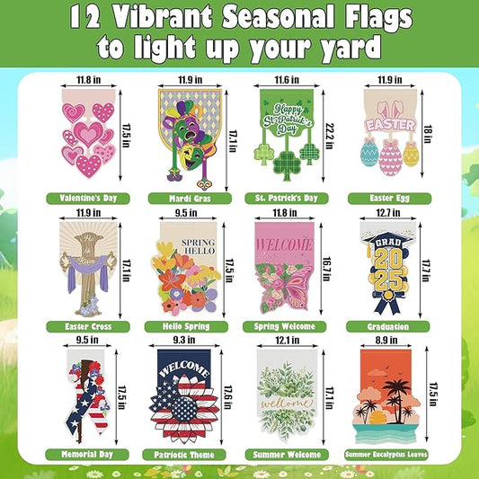 12 Pcs Seasonal House Flags 28x40 Double Sided Seasonal Large Garden Flags for All Seasons Set of 12 Spring Easter Valentine Halloween Christmas Holiday Yard Decoration, Welcome Outdoor Decor 28x40 In