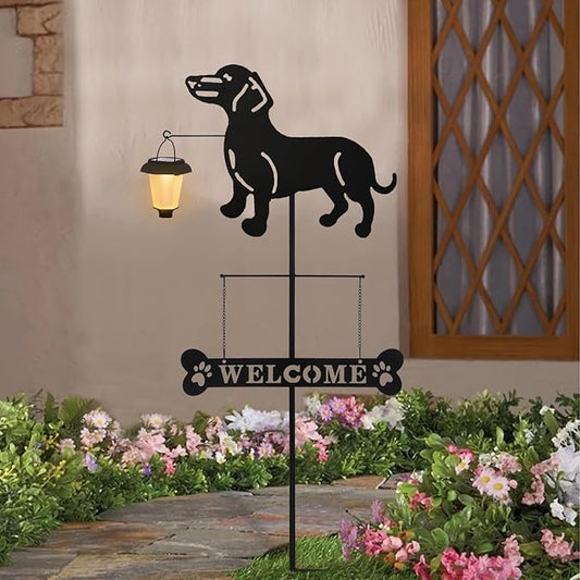 BAYN Solar Dachshund Silhouette Dog Breed Welcome Sign with a Lantern Outdoor Decorative Garden Stakes for Yard, Lawn, Patio, Pathway