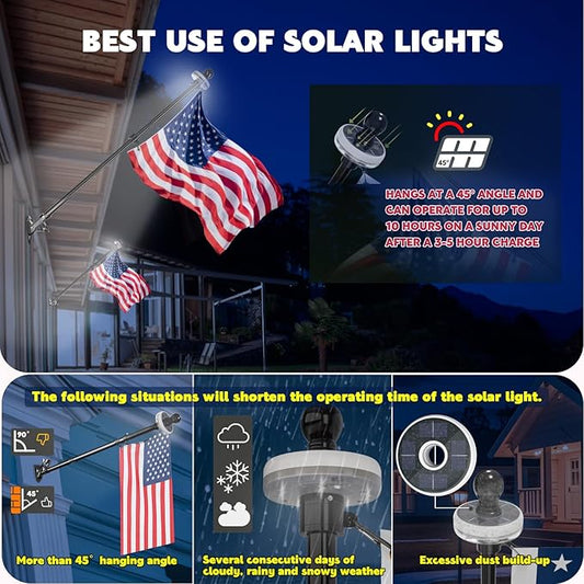 ZMTECH 2 Pcs 6 FT Flag Pole with Solar Light - Adjustable Bracket, Stainless Steel Flag Poles for Outside House, Tangle Free Flag Pole Holder Kit for American Flag (Without Flag, Black)