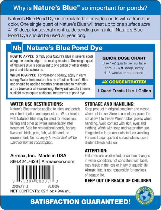 Airmax Nature's Blue Pond Dye 4X Concentrate for Outdoor Ponds & Lakes, Natural Pond Colorant & Beauty Enhancer, Block Ultraviolet Rays, Fish, Bird & Livestock Safe, Easy Liquid Application, 1 Quart