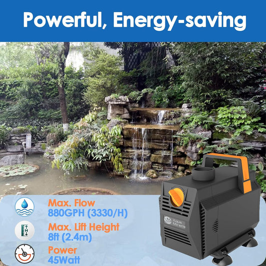 AquaMiracle 880GPH Submersible Water Pump Pond Pump(3330L/H, 45W), Water Fountain Pump Aquarium Water Pump with Flow Control for Fish Tank, Waterfall, Statuary, Filtration, Water feature, Hydroponics