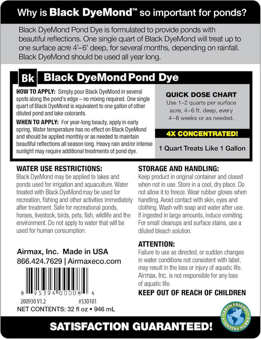 Airmax Black DyeMond Pond Dye 4X Concentrate for Outdoor Ponds & Lakes, Natural Pond Colorant & Beauty Enhancer, Block Ultraviolet Rays, Fish, Bird & Livestock Safe, Easy Liquid Application, 1 Quart