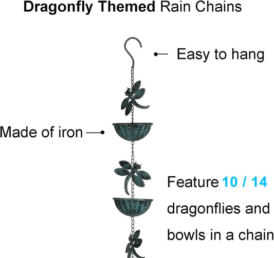 Iron Dragonfly & Cups Rain Chains, 12 Ft Replacement Downspout for Gutters, Antique Blue