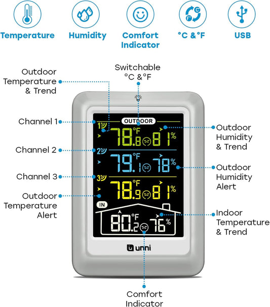 Urageuxy Weather Station Wireless Indoor Outdoor Thermometer with 3 Sensors, Remote Temperature Monitor with Humidity for Home, Baby Nursery, Room, Attic, Patio, Grey