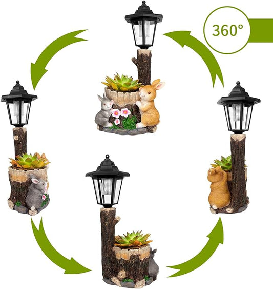 Solar Bunny Garden Stalue Outdoor, Rabbits Figurine Flowerpot Decolwith Solar Lantem for Yard Art Lawn Ornaments Porch Patio Balcony - Gardening Gifts for Women Mom